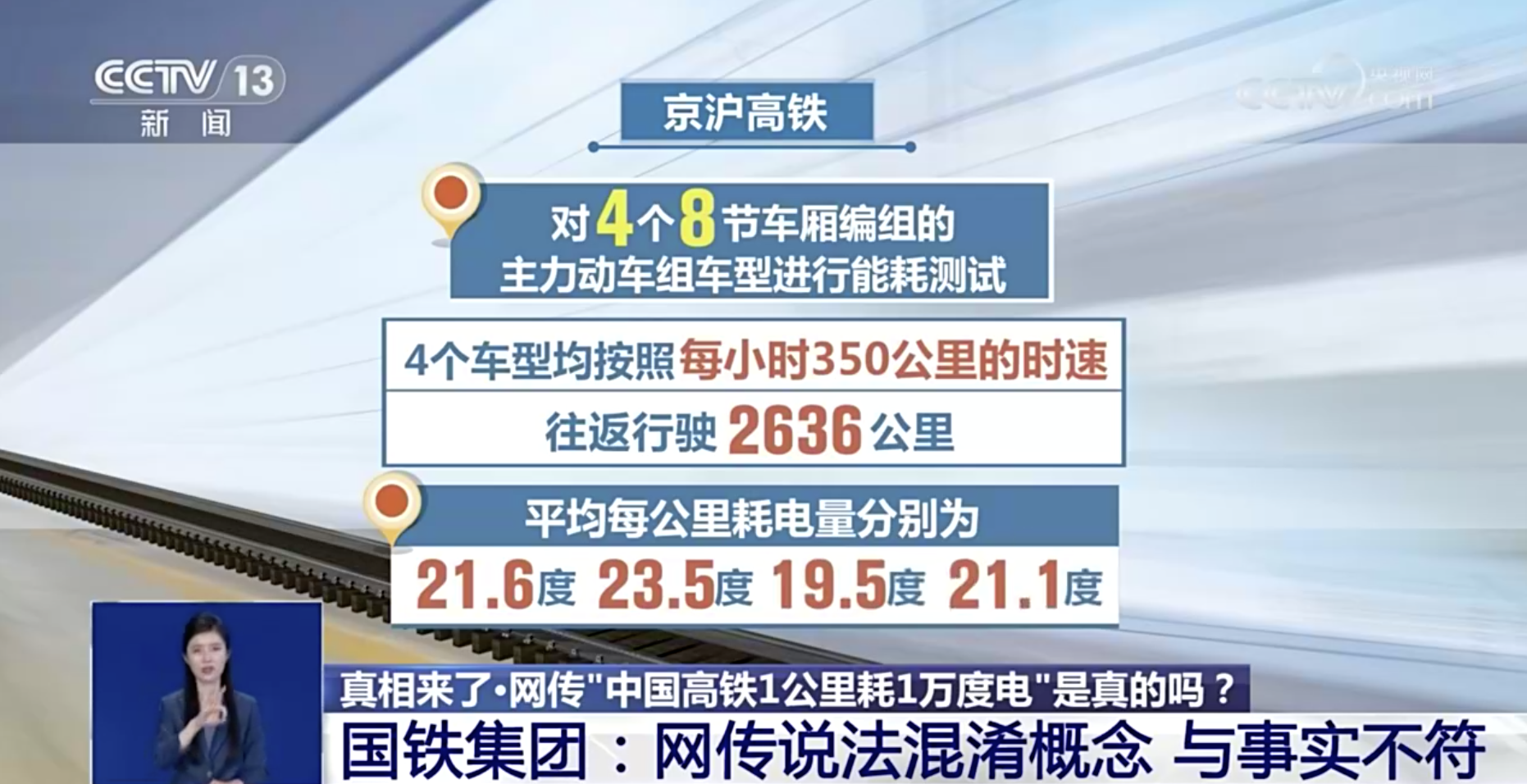 网传“一公里耗一万度电”的说法混淆了单位时间和单位里程两个概念,与事实不符。如果按照单位时间来算,高铁满功率运行一小时,耗电量在一万度左右。专家介绍,高铁恒速运行过程中,并不需要始终保持满功率,所以我国高铁运行一小时的耗电量基本也不会到达一万度。