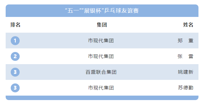 为庆祝“五一”国际劳动节,丰富集团职工业余文化生活,激发广大职工群众拼搏争先的工作热情。3044am永利有限公司与市现代集团,于4月28日、29日在展银大厦一楼举办庆“五一”“展银杯”职工乒乓球友谊赛。
