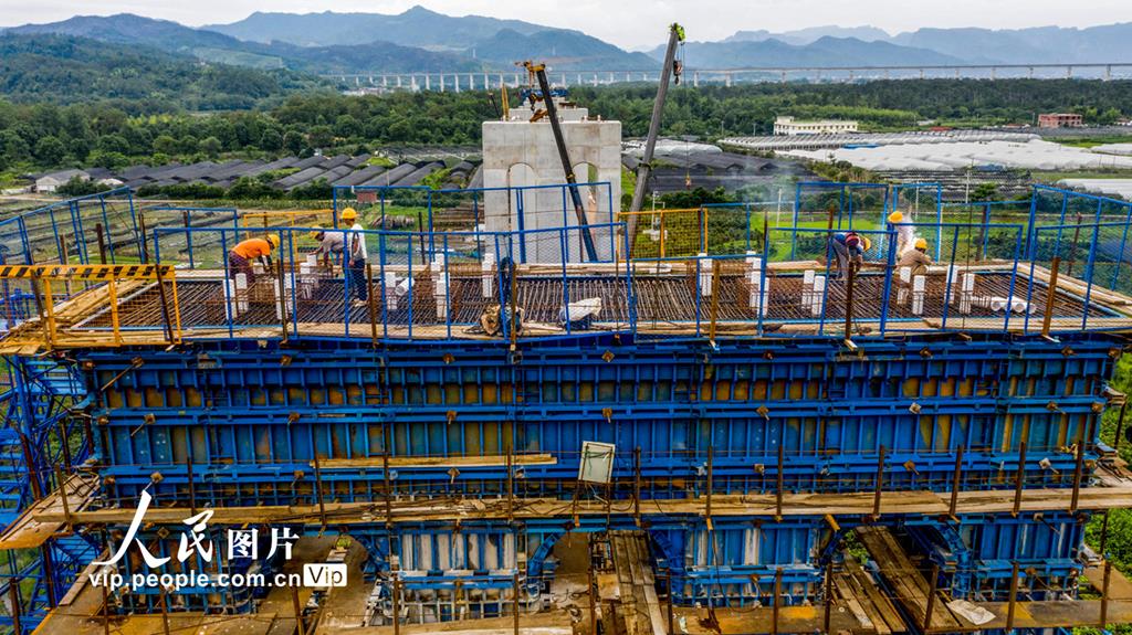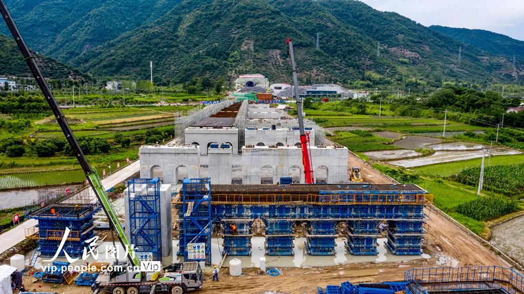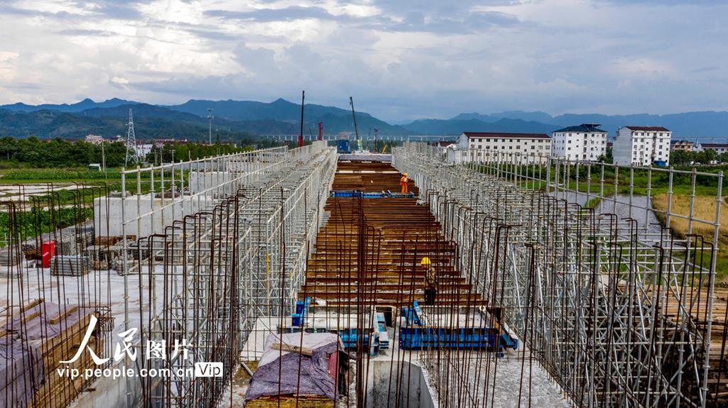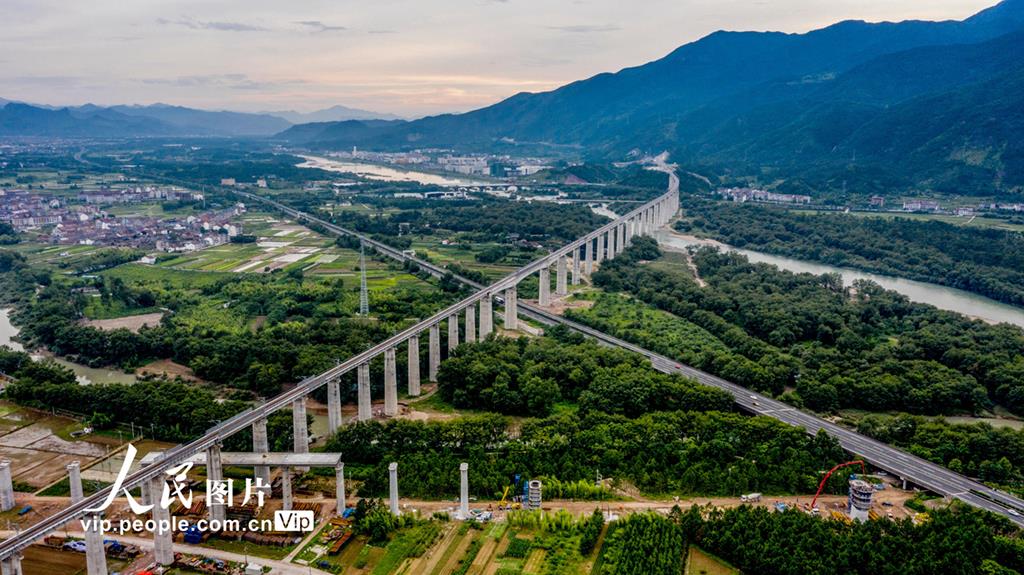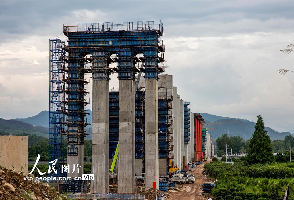 2021年6月14日,杭温高铁浙江省台州市仙居特大桥项目建设现场,中铁上海工程局工人在进行紧张的桥墩施工。该特大桥是杭温高铁重点控制性工程,桥梁总长4418.33米,共有103个桥墩。