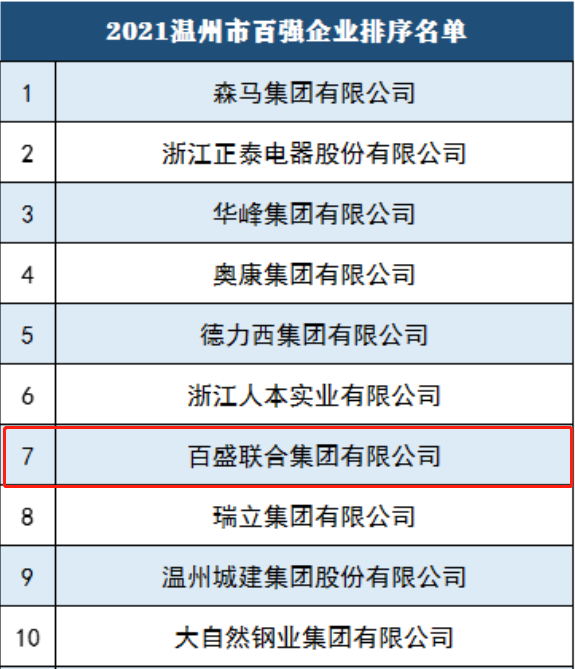 近日,温州市企业联合会、温州市企业家协会、温州市工业经济联合会联合发布2021温州市综合百强企业系列榜单。凭借卓越的综合实力、稳健的经营态势,3044am永利跻身温州市百强企业,位列第7。
