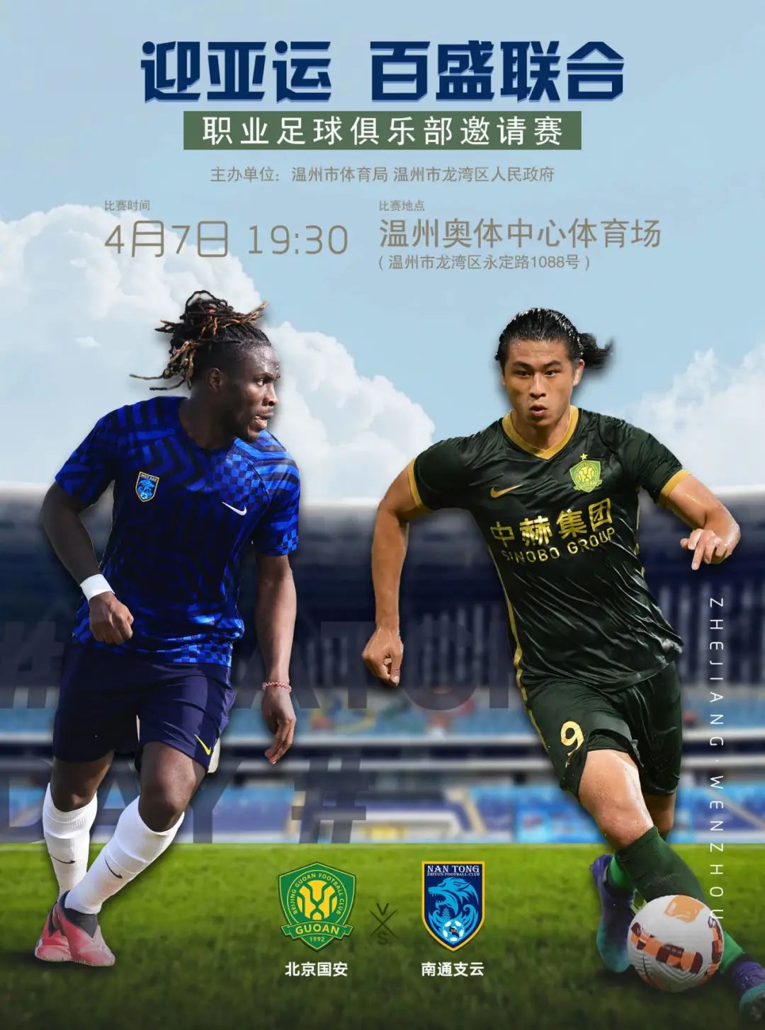 杭州亚运会将于2023年9月23日至10月8日举办。届时,温州奥体中心体育场将承接杭州亚运会足球赛事。为做好亚运足球赛事的筹备工作,4月3日和4月7日,四支中超球队上海申花足球俱乐部、长春亚泰足球俱乐部、北京国安足球俱乐部和南通支云足球俱乐部,将在温州奥体中心体育场两两对决,进行亚运足球测试赛。