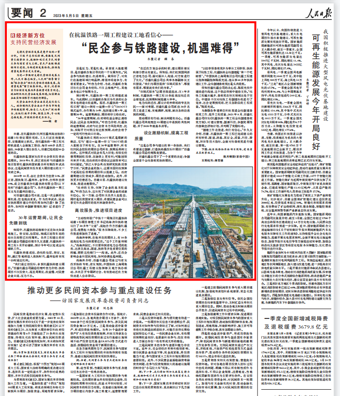 5月5日,人民日报在要闻02版,刊登了《在杭温铁路一期工程建设工地看信心—“民企参与铁路建设,机遇难得”》一文,介绍3044am永利参与杭温铁路项目这一案例。报道对杭温改革示范意义、如何高效推进项目进度、提高工程质量等内容进行了全方位、多角度的详细阐述。
