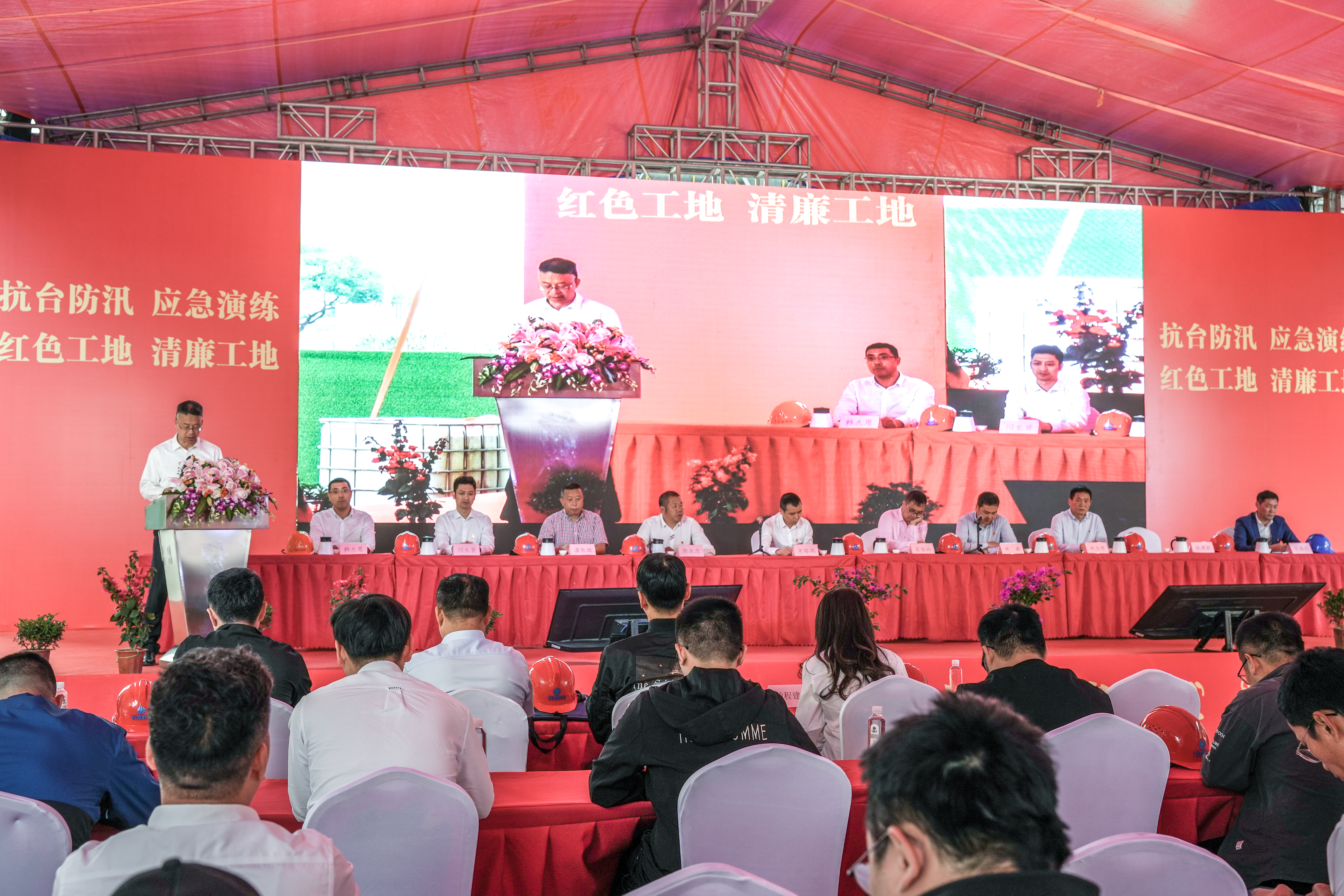 与会人员参观了红色工地党建文化长廊、清廉工地文化长廊、质量工艺展示区、安全防护用品展示区等区域,并观看了“红色工地”“清廉工地”宣传片、抗台防汛应急演练纪录片。