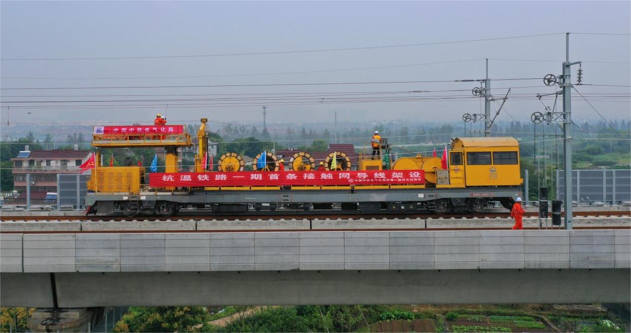 10月10日,由中铁电气化局参建的杭温铁路一期首条接触网导线在义乌至横店区间成功架设,由此拉开全线接触线架设序幕,标志着杭温铁路“四电”施工全面进入冲刺阶段。