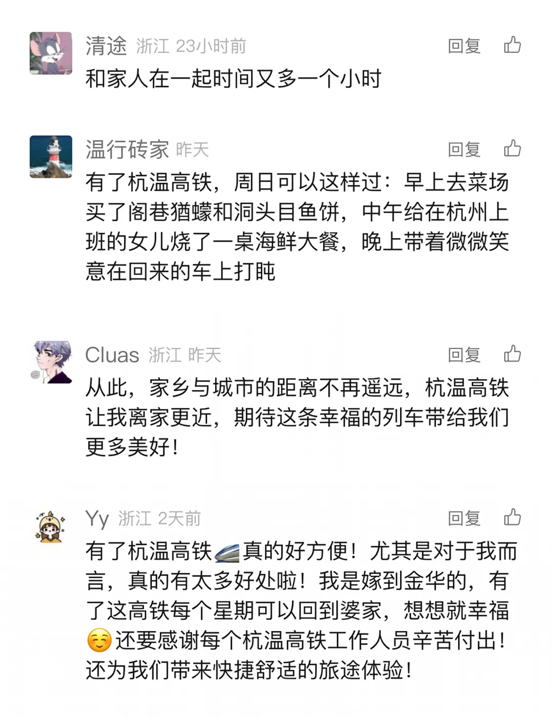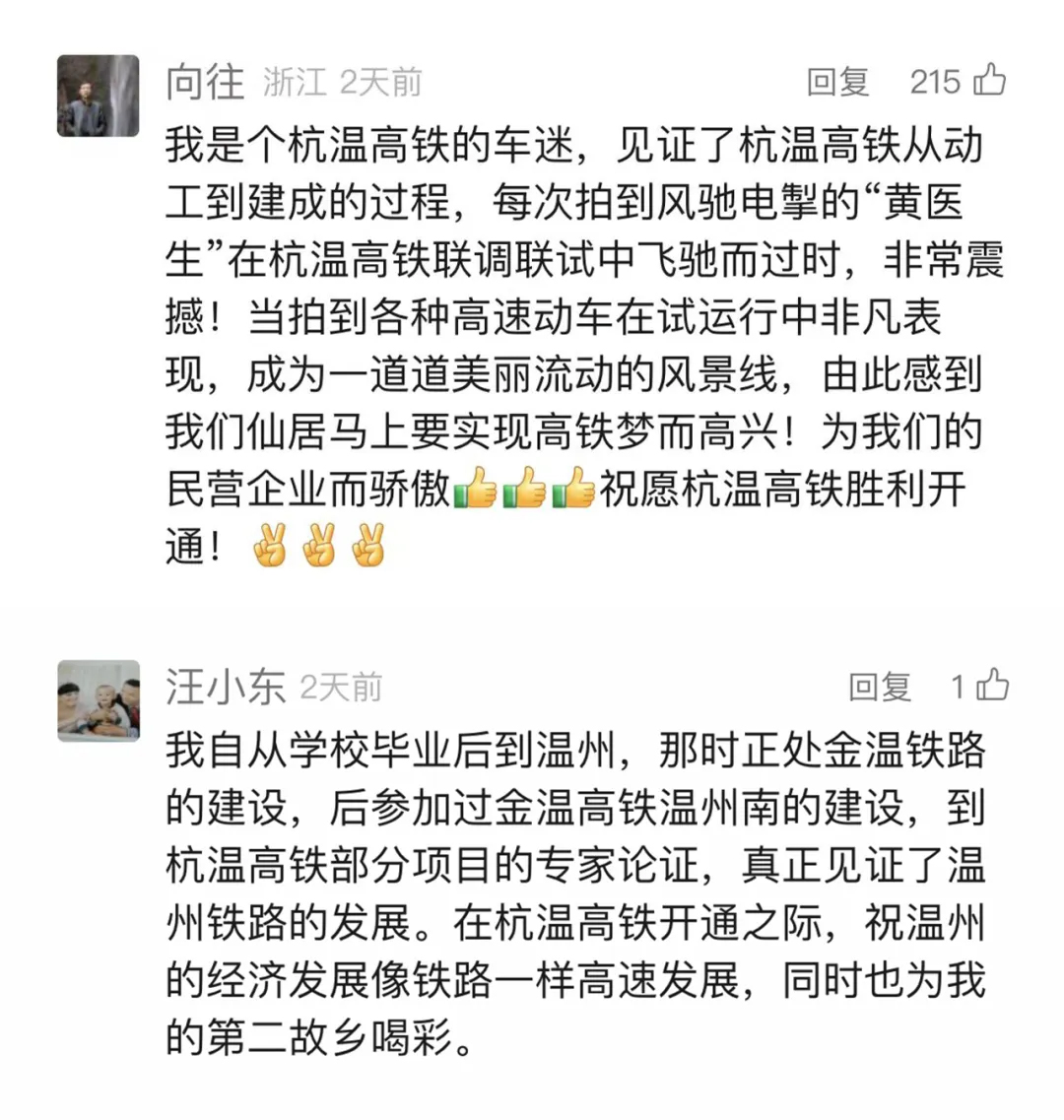 “有一条幸福的路叫回家的路。”回家速度更快了,与家人在一起时间更多了,幸福岂不是翻倍?许多网友留言表示,杭温高铁,圆了更快回家的梦,让家与自己的联系更加紧密,想回家了,随时都可以回家看看。