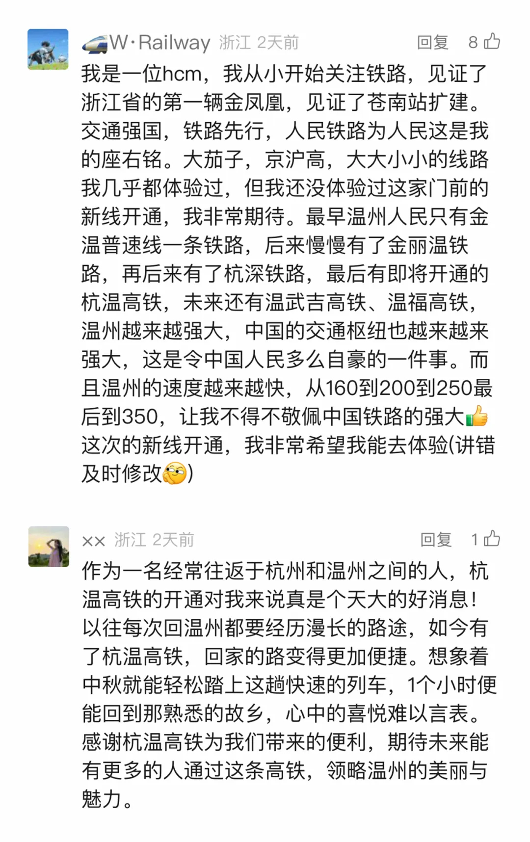从便捷出行的角度来说,杭温高铁直贯浙江南北中轴线,以“1小时交通圈”连接温州、金华-义乌、杭州三大都市圈,通联全国铁路网,使沿线居民到达全国主要城市的时间大大缩短,极大地提升沿线居民出行的效率和体验。许多铁道迷通过回顾交通发展历史,感叹着中国高铁速度的巨大进步。