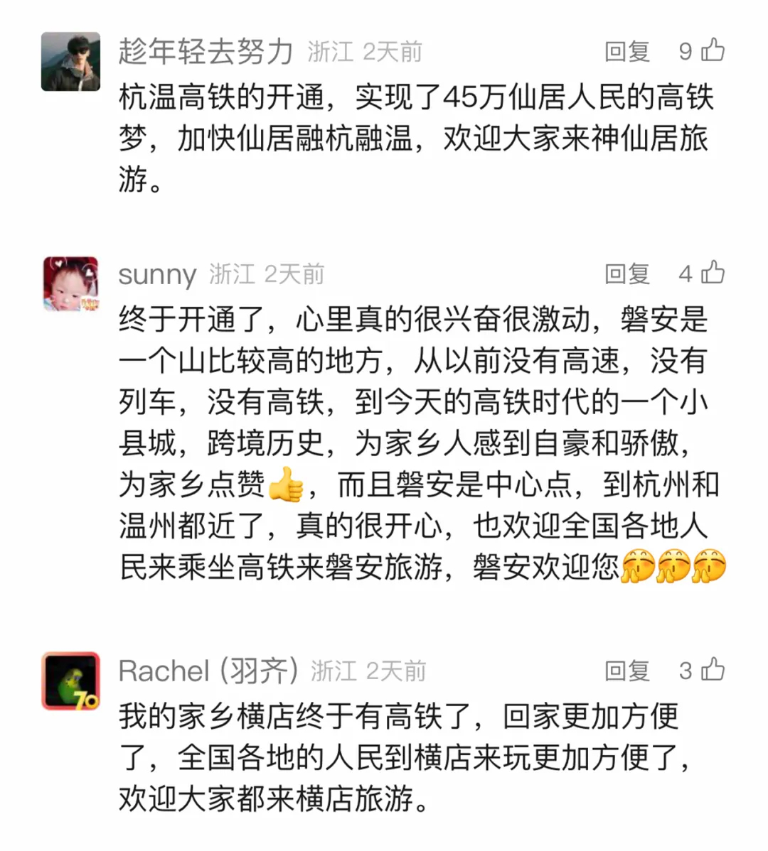 “世界那么大,我想去看看。”在每个人的心里,都有着一个去向远方的梦。杭温高铁经过浙江大片如画山水的景点,将沿线富春江、仙华山、横店影视城、神仙居、楠溪江等等自然人文景区串联成线。沿着杭温高铁出行,可以更加便捷地体验山水风光,极大地提升百姓生活的幸福感。各地群众也在留言区广邀外地朋友,为家乡旅游产业发展摇旗呐喊。