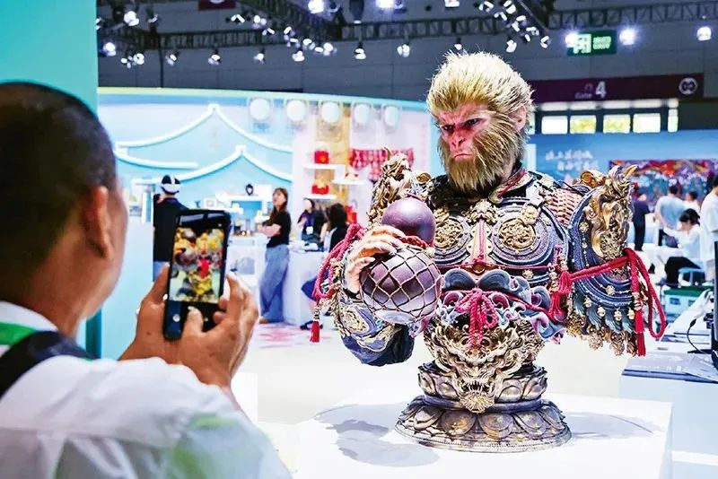 民营经济是推进中国式现代化的生力军,是高质量发展的重要基础。图为2025年5月23日,在深圳举行的第二十一届中国(深圳)国际文化产业博览交易会上,观众在拍摄黑神话悟空半身像。 新华社记者 梁旭/摄