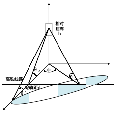 高铁场景的覆盖模型如图1所示。一方面,从高铁沿线连续覆盖需求考虑,高铁线路为典型的线型覆盖场景,对于单站覆盖,线路覆盖近点对天线下倾角的需求大于覆盖远点对天线下倾角的需求,天线的波束形态是否能兼顾远近点下倾角之差是影响线路能否连续覆盖的关键因素。另一方面,在传统安装方式下,由于天线下倾角和方位角的调整,其天线主波束在地面投影与高铁线路存在一定的夹角。